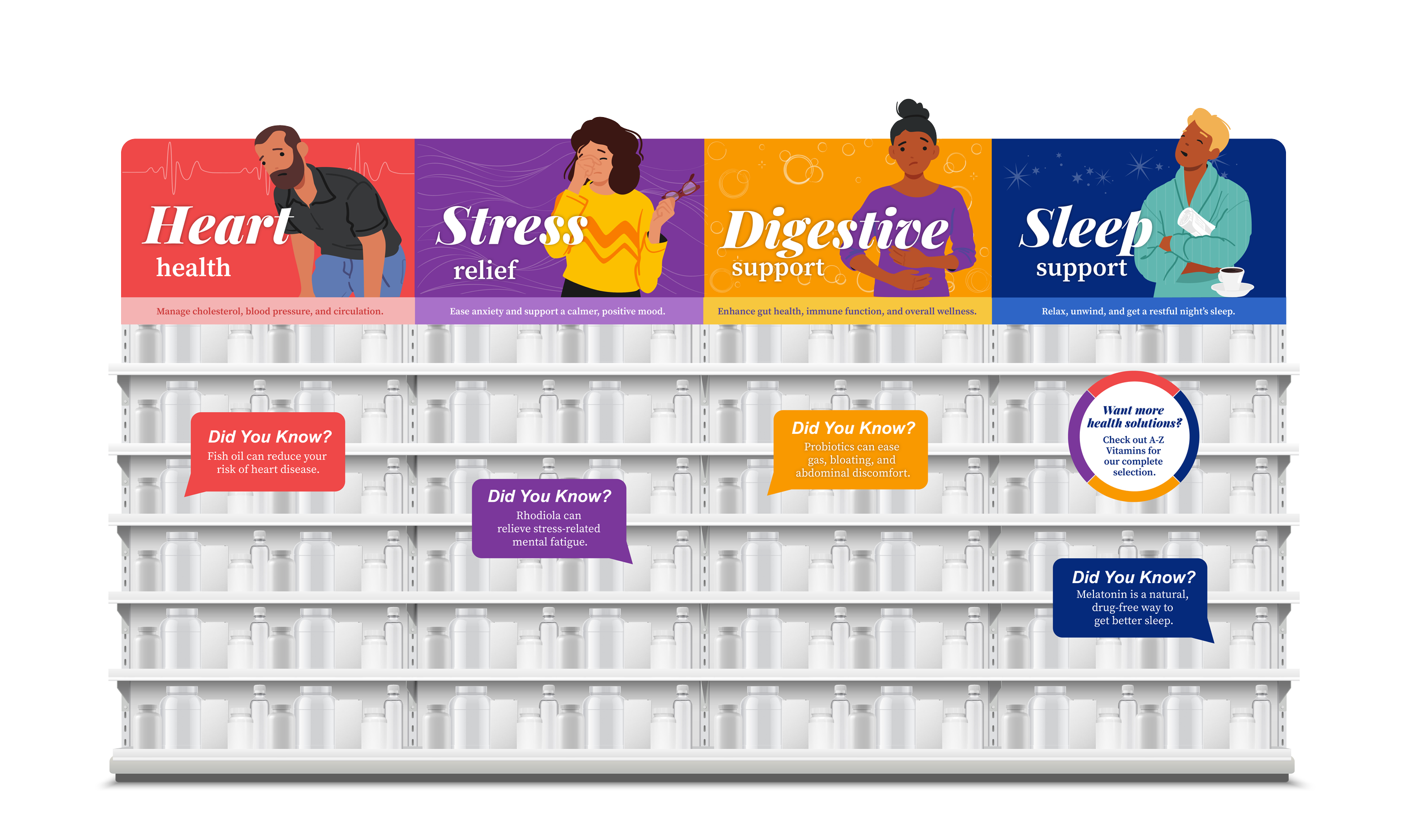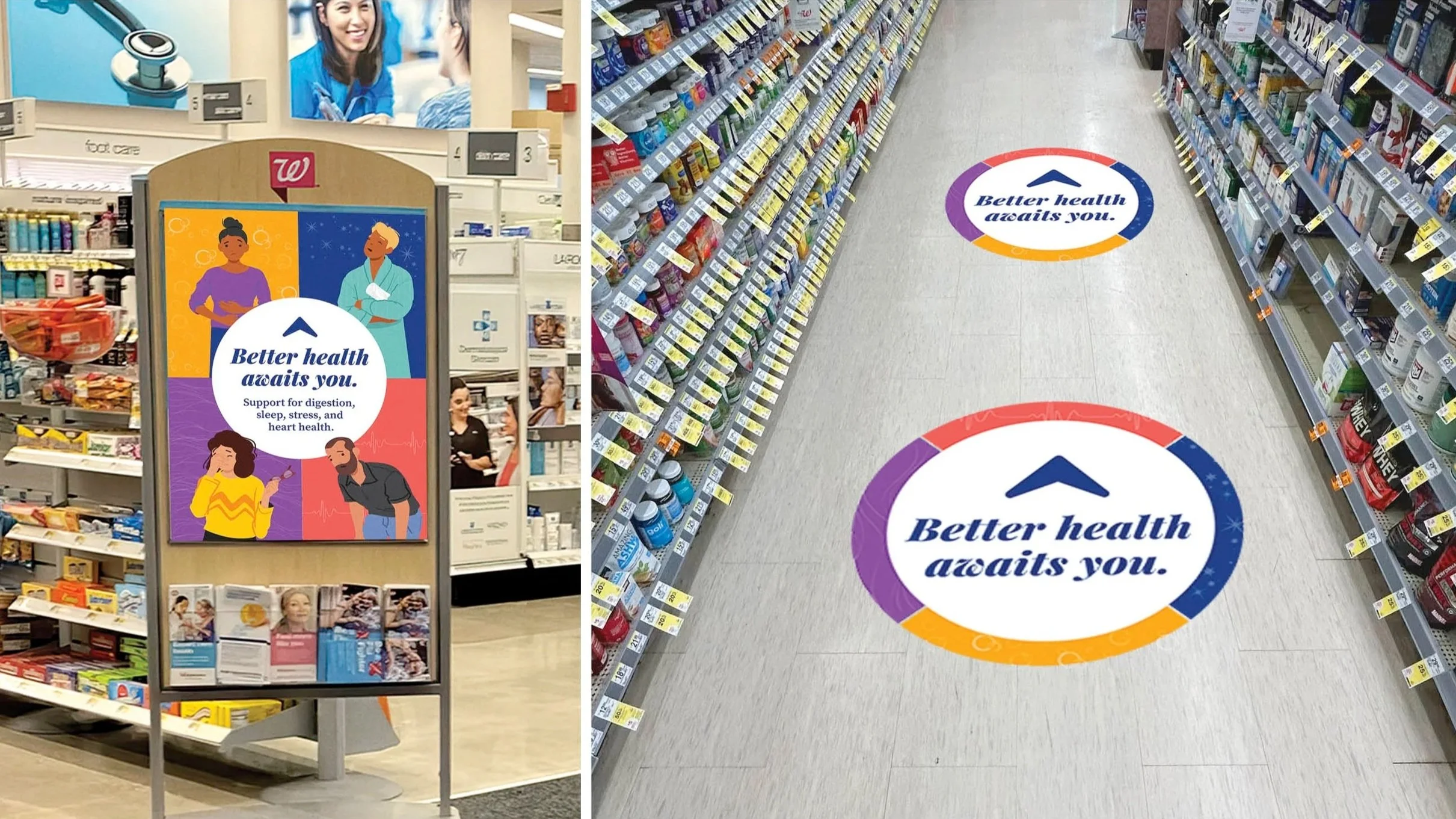 Nestlé partnered with our team to create an in-store marketing experience for their line of vitamins at Walgreens. The campaign included a custom floor directional decal and branded shelf displays designed to guide shoppers to the product and make it stand out in-store. The concept emphasized that Nestlé’s vitamins offer solutions for every need and ailment, creating a cohesive and visually engaging customer experience.