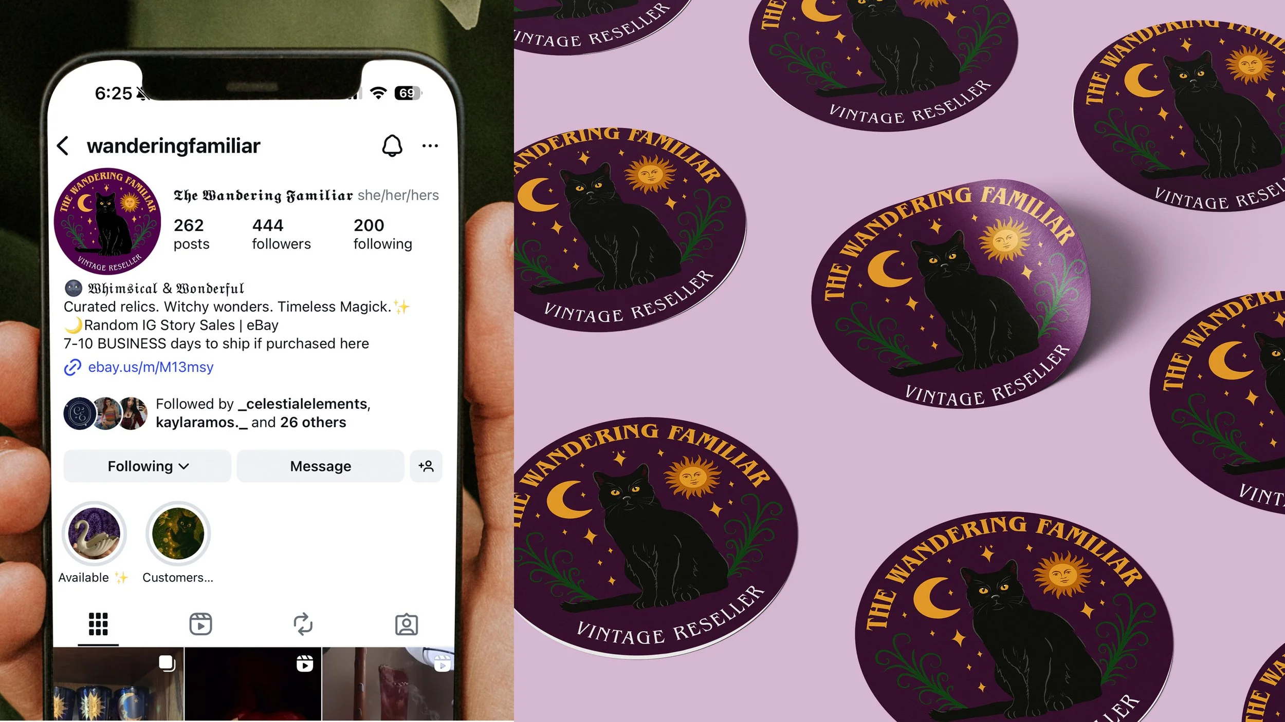The Wandering Familiar is a small online shop specializing in 70s–90s vintage home décor and trinkets with a witchy, whimsical aesthetic. The client requested a logo refresh that would make her black cat mascot stand out more while retaining a dark plum background. This project presented a unique challenge—balancing low-contrast colors while maintaining visual impact. Through careful use of tone, texture, and contrast, the redesign enhances the cat as a focal point while preserving the moody, magical atmosphere central to the brand.